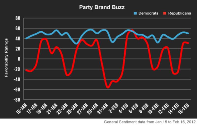 For curiosity, we also ran "Democrat'' and its offshoots to compare the buzz. The sources that mention both party names are far from identical. Web users are predominantly younger, and certainly tend to be more liberal. You also run into problems gauging the word "democratic," as in "party," for obvious reason. But the broader trends suggests that while Republicans undergo a period of intense self reflection, Democrats have avoided the existential look inward, staying mostly above the fray with a positive web favorability. That will undoubtedly change as the general election heats up, drawing as much focus on the parties as the candidates. From a starting point, however, the field doesn't appear quite level.