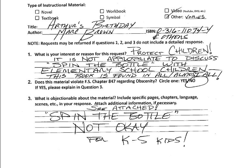 On his form, Friedman wrote, “PROTECT CHILDREN!! IT IS NOT APPROPRIATE TO DISCUSS ‘SPIN THE BOTTLE’ WITH ELEMENTARY SCHOOL CHILDREN. THIS BOOK IS FOUND IN ALL/ALMOST ALL [DISTRICT SCHOOLS]!”