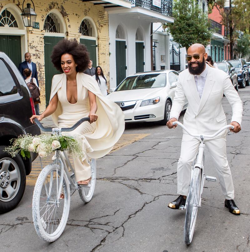 A brief, but necessary, sojourn away from the red carpet. This is the only way to get married, with bride and groom looking equally spiffy, hot, and totally original. Solange Knowles, wearing a pre-ceremony ensemble by Stephane Rolland, and her fiance, music video director Alan Ferguson, ride bicycles on the streets of the French Quarter en route to their wedding ceremony at the Marigny Opera House on November 16, in New Orleans.