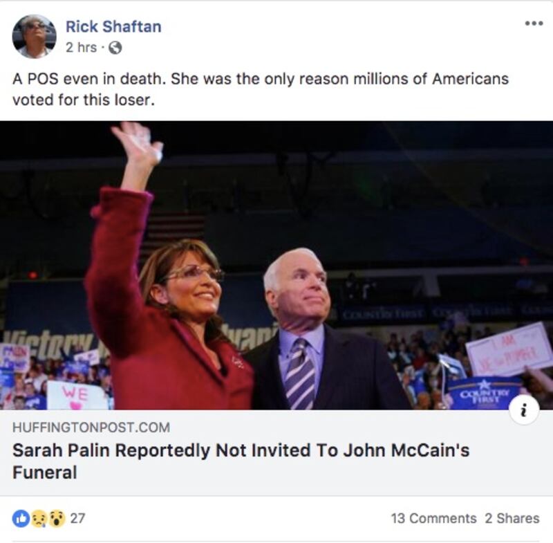 Rick Shaftan, a campaign consultant for Virginia’s Republican U.S. Senate candidate Corey Stewart, said in a recent Facebook post that the late Sen. John McCain is a “POS [piece of shit] even in death.” Shaftan posted a link to an article saying that the recently deceased senator’s 2008 vice-presidential pick Sarah Palin was not invited to attend the senior statesman’s funeral. “She was the only reason millions of Americans voted for this loser,” Shaftan continued. As The Daily Beast previously reported, Shaftan called majority-black cities “shitholes” in other social-media posts.