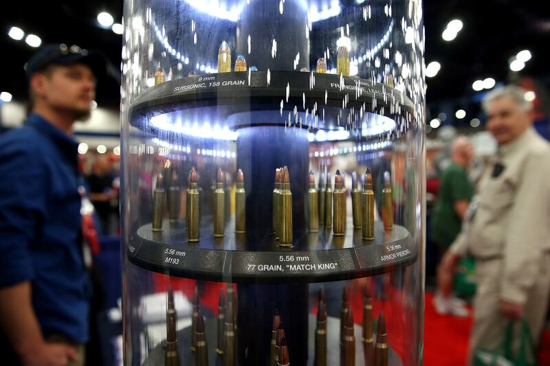 An attendee carefully inspects a scope on an assault rifle at the George R. Brown Convention Center. This year's convention features nearly 550 exhibitors, a gun trade show, youth day, firearms classes, and a speech by rocker and NRA supporter Ted Nugent.