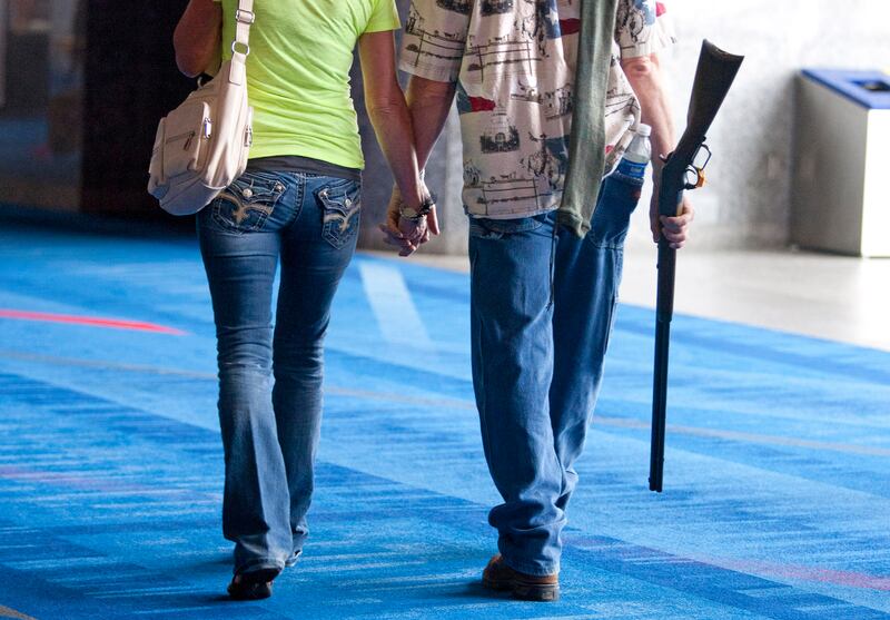 Barry Bailey and his wife, Judy, of DeRidder, La., walk hand-in-hand after having their 1873 Winchester shotgun appraised for the Antique Guns and Gold Showcase.