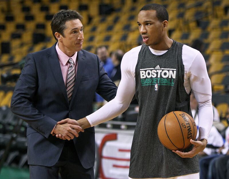 Dr. Brian McKeon, left, the Celtics Chief Medical Officer and Head Team Physician shakes hands with Celtics guard Avery Bradley, right, who was on the court shooting about an hour and a half before the game testing his injured shoulder. After they spoke for a moment they left the court together. The Boston Celtics hosted the Atlanta Hawks for game four of a first round Eastern Conference NBA Playoff Game at TD Garden.