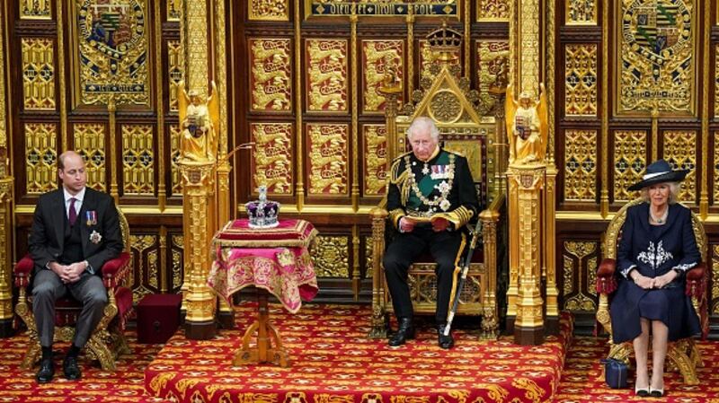 Britain's Prince Charles, Prince of Wales (2nd R) reads the Queen's Speech as he sits by the Imperial State Crown (2nd L), Britain's Camilla, Duchess of Cornwall (R) and Britain's Prince William, Duke of Cambridge (L) in the House of Lords chamber, during the State Opening of Parliament, at the Houses of Parliament, in London, on May 10, 2022.