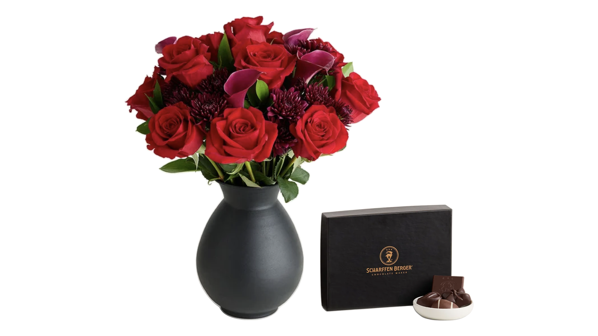 This mix of roses and miniature burgundy calla lilies exudes mystery and allure. Plus, it comes with a box of premium chocolate, adding just enough sweetness to turn this last-minute gift into a true Valentine’s Day moment.
