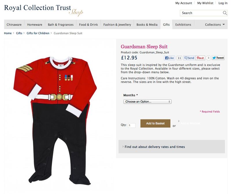 The Royal Collection Trust Shop sells this guardsman sleep suit complete with a bearskin hat. We're not sure how well a baby would sleep in a hat like that, but he sure would look cute.
