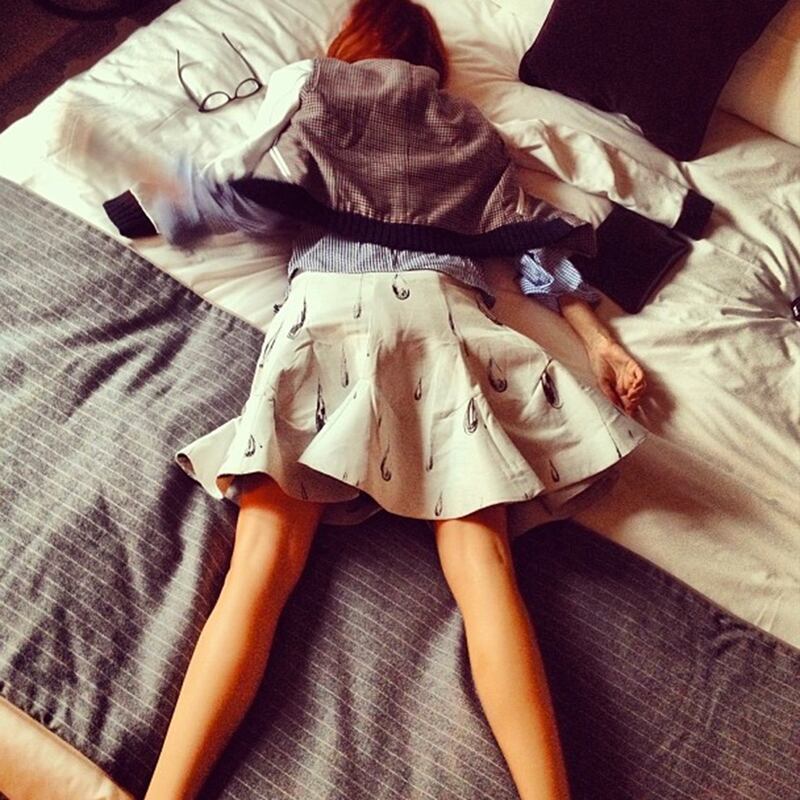 Fashion coma? Exhausted Moda Operandi Artistic Director Taylor Tomasi-Hill face plants onto her bed for a well-deserved nap.