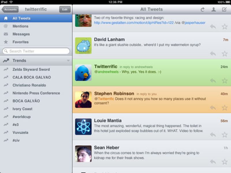 Genius Factor: There are other popular Twitter apps for the iPad, such as TweetDeck. But on The Daily Beast's panel, Twitterific popped up as the app of choice for how it makes the most of the iPad screen—giving space not just for tweets from those you follow but also an update on the top Twitter trends.