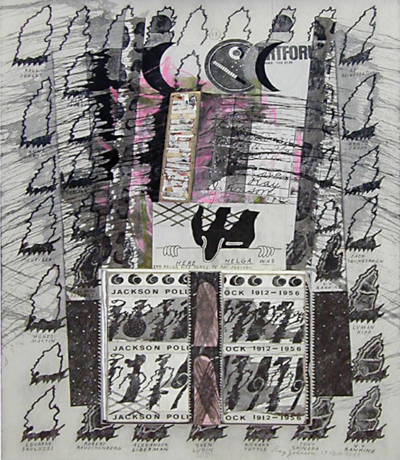 Kelly’s “Center plus peripheries #2” features a blank canvas with five black-and-white images orbiting its outer border: two men, a garbage bag, a thumb, and—in homage to childhood—a cartoon-like character.