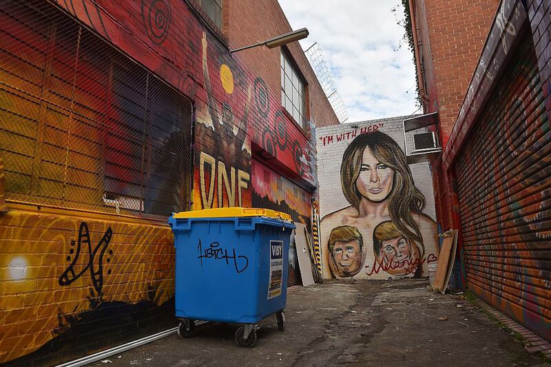 A mural depicting Republican US presidential nominee Donald Trump over the breasts of his wife Melania, created by street artist Lushsux, is seen on a wall in West Footscray in Melbourne on July 30, 2016. An Australian mural of US presidential nominee Hillary Clinton in a revealing, stars and stripes swimsuit may be taken down, after it has reportedly been deemed offensive. The creator of the painting, the street artist who goes by the name Lushsux and who has also painted murals of the likes of Donald Trump and Kim Kardashian, branded calls to remove it 'pathetic'.