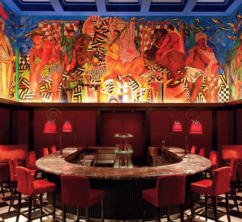 Originally commissioned as an escape to medieval Siena, Sandro Chia instead opted to transport bar patrons to the frenzy known as the Palio di Siena horse race. The fiery scene graced the backdrop of the Palio Bar from its opening in 1986 until its recent closing. While we await a new owner, just imagine looking at that feverishly combustible scene after a few cocktails.