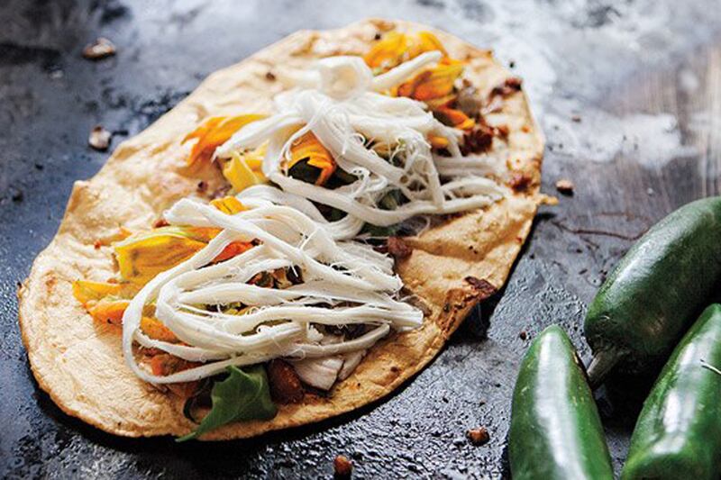 I hope you’re hungry. Because there are also pig’s-brain quesadillas; pancita, a deeply savory beef broth with chunks of tripe finished with fresh oregano and a squeeze of lime juice; tacos filled with pig’s feet cured in vinegar; woven baskets heaped with just-baked bread; quesadillas stuffed with squash blossoms; heirloom tomatoes (which, around here, aren’t considered heirloom yet); free samples of chicozapote, a red-fleshed fruit with a flavor somewhere between nutmeg and cinnamon; unpasteurized cow’s milk cheese; tamales; enchiladas; fresh-squeezed orange juice; and locally grown, locally roasted coffee beans.