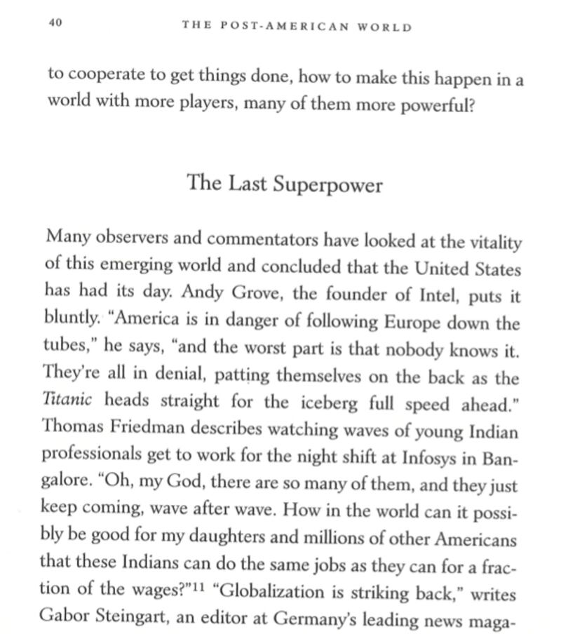 Zakaria’s 2008 book, “The Post-American World,” contains a quote from former Intel Corp. chief executive Andy Grove about the nation’s economic power. “America is in danger of following Europe down the tubes, and the worst part is that nobody knows it,” Grove says in Zakaria’s book. “They’re all in denial, patting themselves on the back as the Titanic heads straight for the iceberg full speed ahead.”