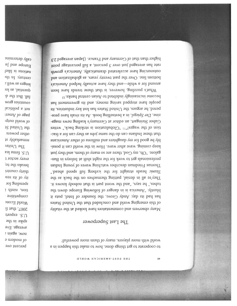 Above is a PDF of the relevant footnotes of the 2009 paperback edition; below follows a PDF of the relevant pages in the 2008 hardcover. Prestowitz is credited both times. Had Farhi clicked Amazon's "look inside this book" button, he would have seen the footnote for himself. It follows that he didn't. Given the gravity of the accusation he lodged against Zakaria, that omission seems a grave act of journalistic malpractice.