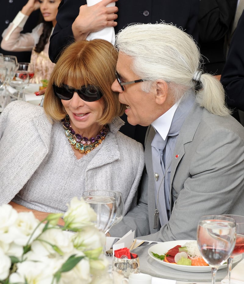 Lagerfeld whispers to friend Anna Wintour at the FIT Couture Council's annual luncheon at Avery Fisher Hall on September 10, 2010.