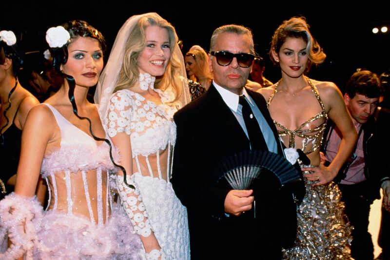 Lagerfeld poses with Helena Christensen, Claudia Schiffer, and Cindy Crawford at the showing of Chanel's spring-summer haute couture collection in 1993. At the time Lagerfeld was going through a brief obsession with fans as an accessory.