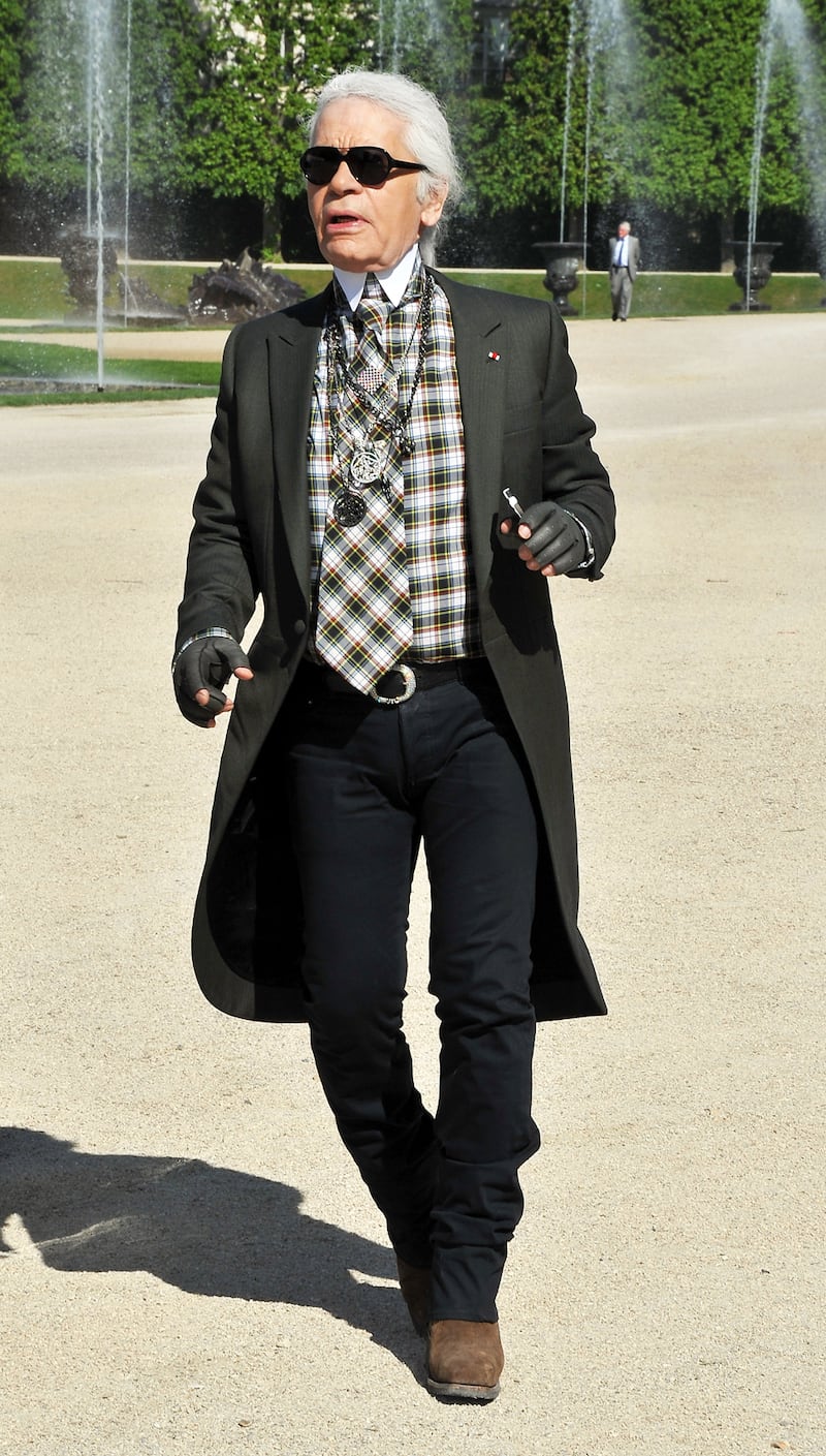 Lagerfeld arrives at the Chanel 2012–13 Cruise Collection at Versailles on May 14, 2012, proudly wearing plaid.