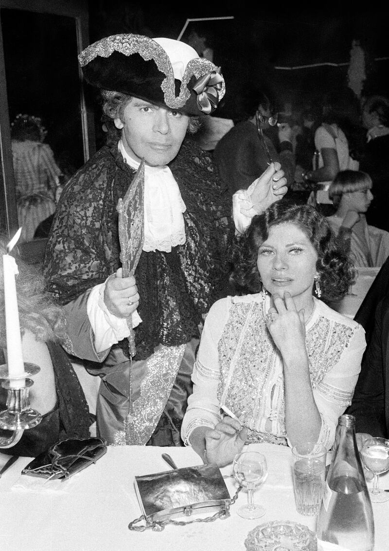 Lagerfeld, dressed here in a dapper dandy costume, poses with Princess Soraya at the Venetian Ball at the Palace in Paris on October 26, 1978.