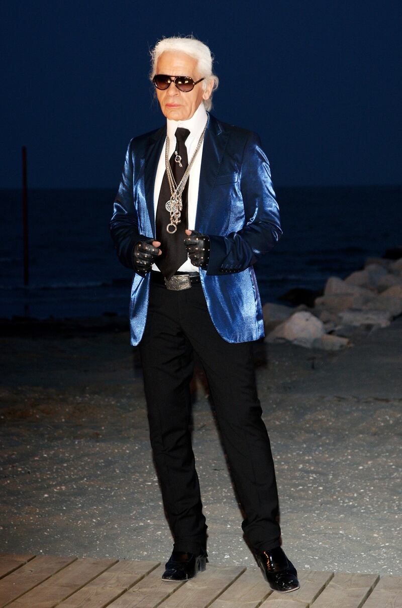 Lagerfeld in a blue velvet blazer to the Hotel Excelsior on May 14, 2009, in Venice.