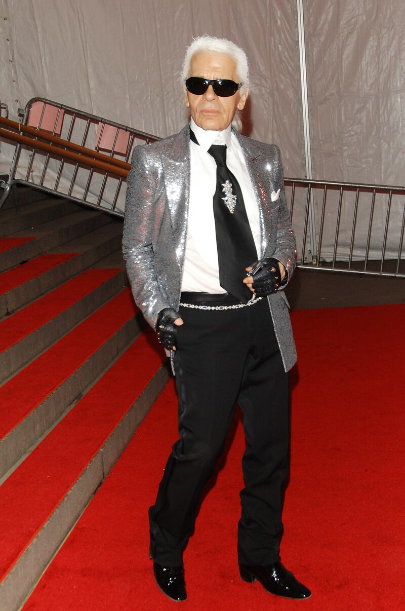 Lagerfeld attends the Metropolitan Museum of Art's Costume Institute Gala in New York on May 5, 2008, wearing a shimmering silver jacket.