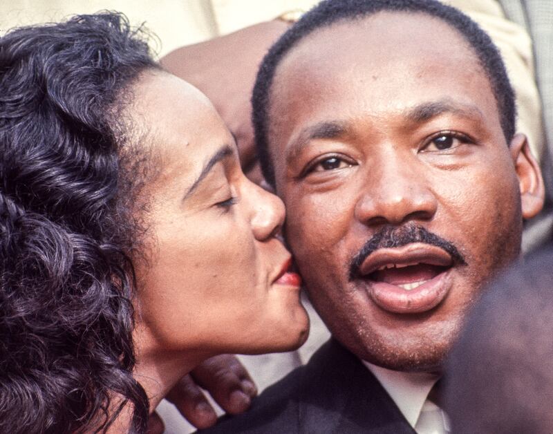 Ben Martin· Coretta Scott King bussing Martin Luther King Jr. on the cheek following his speech in Montgomery, Alabama, at the culmination of the Selma March, March 25, 1965.