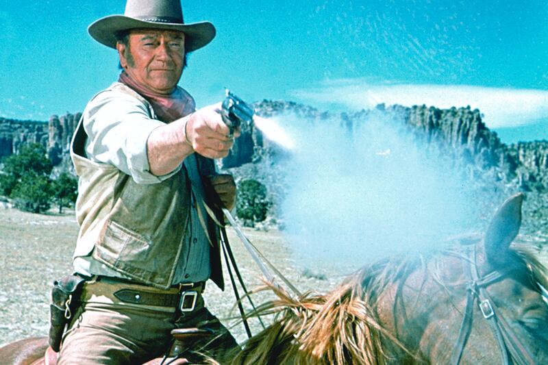 Eyman is on surer ground with what he calls Wayne’s “dangerously extreme” politics. He does a nice job of teasing out the contradictions in Wayne’s faith in personal responsibility, his belief that “government is the enemy of the individual,” and his admission that he was just “a stagehand who got lucky.” And he points out that the most iconic performances of Wayne’s career—Ethan Edwards in The Searchers, Tom Doniphon in The Man Who Shot Liberty Valance (1962), even the outlaw the Ringo Kid in Stagecoach—came in movies that “focus on the need to subordinate individual needs to a collective good.” Shooting The Comancheros in 1961, Wayne spotted a JFK button on the lapel of the future screenwriter Tom Mankiewicz. “We don’t advertise socialists on my set,” he joshingly barked. Fair enough, though despite The Green Berets (1968), a risible dud in which the by then 61-year-old Wayne’s Colonel Mike Kirby all but singlehandedly fought the Vietnam war, not all Wayne’s movies were advertisements for free-market libertarianism either.