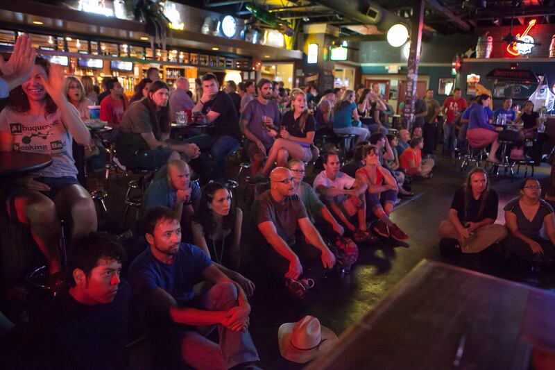 Hooligans Tavern hosts viewing parties of the final episodes of the series. The events, sponsored by Yelp, are organized by Miguel Jaramillo, bottom right wearing the Vamonos Pest t-shirt, who started an Instagram fan site which currently has over 9,000 followers.