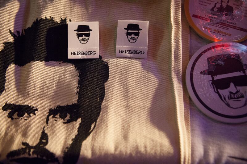 Breaking Bad-inspired products are displayed at a viewing party in Albuquerque. Brian Bailey, a local vendor who works at Guerrilla Graphix creating and selling the items, says, "People come from all over the world, and they might be grappling with english, but they know the Breaking Bad icons, and they're hot on it."