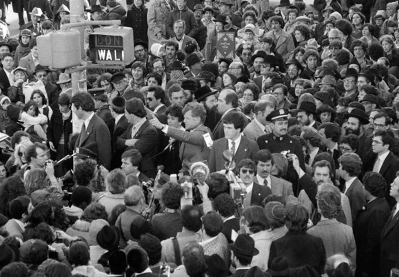 Sen. Edward Kennedy, center, addresses massive crowds on the streets of Borough Park, March 23, 1980, Brooklyn, New York.