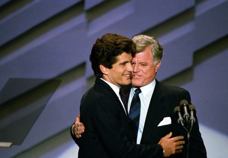 Sen. Edward M. Kennedy, right, and his nephew, John Kennedy, son of the late president, embrace after the younger Kennedy introduced his uncle to the Democratic National Convention on July 19, 1988, in Atlanta.