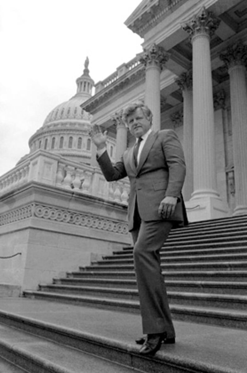 Sen. Edward Kennedy waves to photographers as he leaves the U.S. Capitol after the senate voted to accept the federal gas tax increase, Dec. 23, 1982, Washington, D.C.