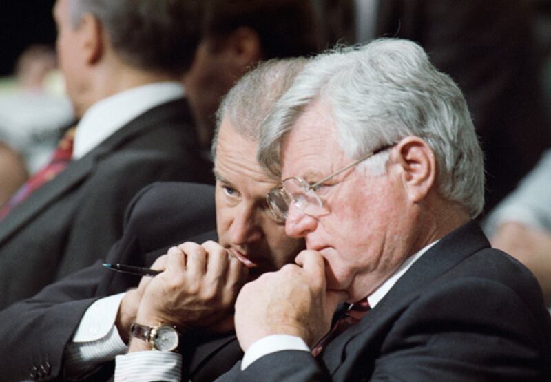 Sen. Joseph Biden, chairman of the Senate Judiciary Committee, left, and fellow committee member Sen. Edward Kennedy huddle during the confirmation hearing for Supreme Court nominee Judge Ruth Bader Ginsburg, July 21, 1993, Capitol Hill, Washington, D.C.