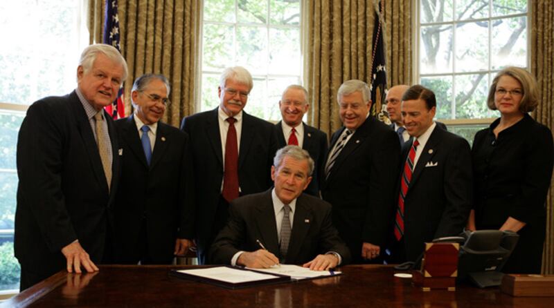 In this photograph provided by the White House, President George W. Bush signs H.R. 5715 into law Wednesday, May 7, 2008, during a ceremony in the Oval Office. The bill, "Ensuring Continued Access to Student Loans Act of 2008," is designed to provide continued availability of access to the federal student loan program for students and families. Looking on are, from left: Senator Ted Kennedy; Congressman Ruben Hinojosa of Texas; Congressman George Miller of California; Congressman Buck McKeon of California; Senator Mike Enzi, (R-WY); Secretary of Treasury Hank Paulson; Congressman Ric Keller of Florida, and Secretary of Education Margaret Spellings.