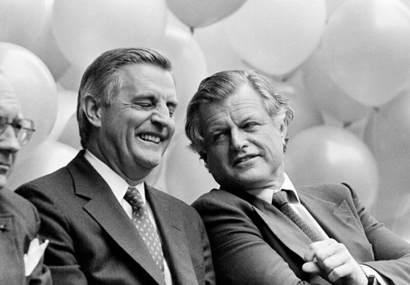 Former Vice President Walter Mondale, left, reacts as he talks with Sen. Edward Kennedy, on Oct. 18, 1982 during dedication ceremonies for Boston's new Floating Hospital for infants and children. The $62 million pediatric facility, part of the New England Medical Center, was named when it was founded in the late 1800s as a shipboard hospital.