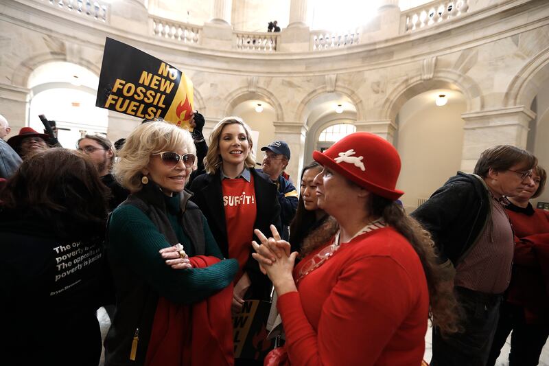 Jane Fonda, June Diane Raphael and Abigail Disney demonstrate inside the Russell U.S. Senate office building during "Fire Drill Friday" climate change protest on November 15, 2019, in Washington, D.C.