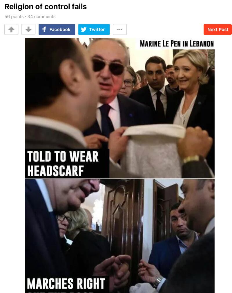 Urbanski upvoted another post praising Marine Le Pen for refusing to wear a headscarf while visiting Lebanon.