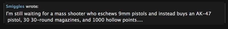 “I'm still waiting for a mass shooter who eschews 9mm pistols and instead buys an AK-47 pistol, 30 30-round magazines, and 1000 hollow points,” Lanza posted in a forum about the Columbine High School shooting in January 2011.