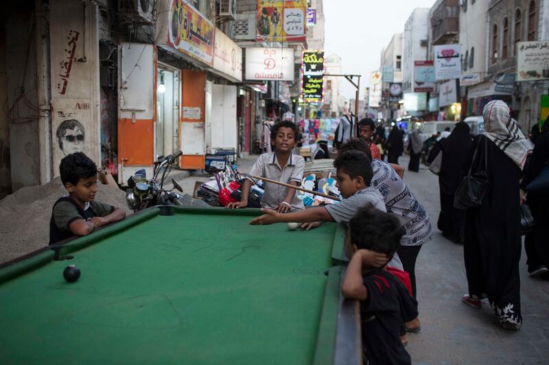 Children play pool in the old town in Crater in Aden, April 22, 2018.