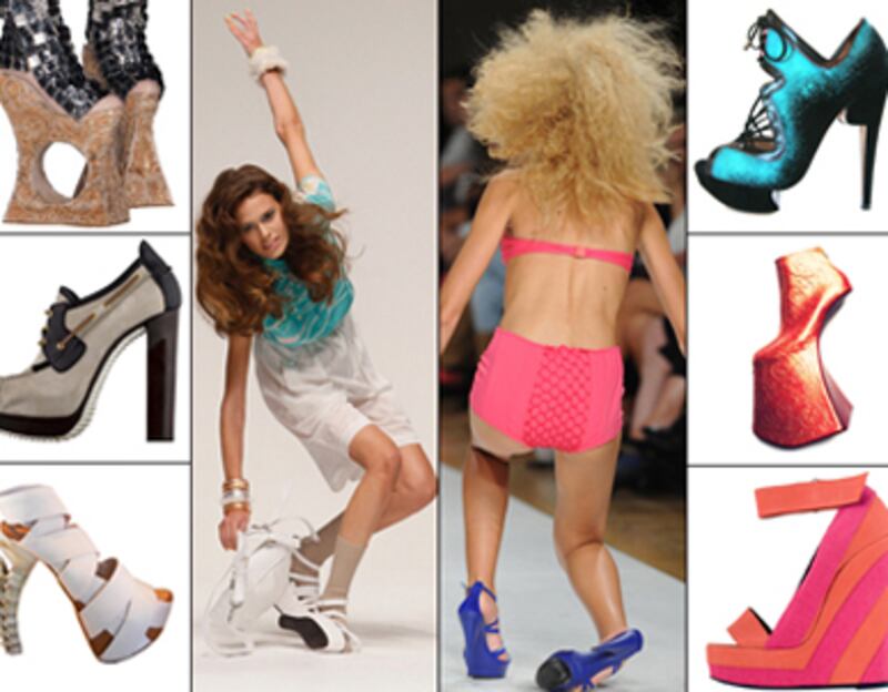 But while the higher-than-ever aesthetic now prevails, it's not necessarily at the expense of stability. It's all about the pitch—the ratio between the heel and the platform—which has enabled designers this season to reach new heights while maintaining walkability. "I don't think a woman could wear a five-inch heel without a platform," says Matthew Dairman, a surgeon and spokesman for the American College of Foot and Ankle Surgeons. "Unless you happen to be a stripper—and well-trained one—at 10- to 15-minute intervals."