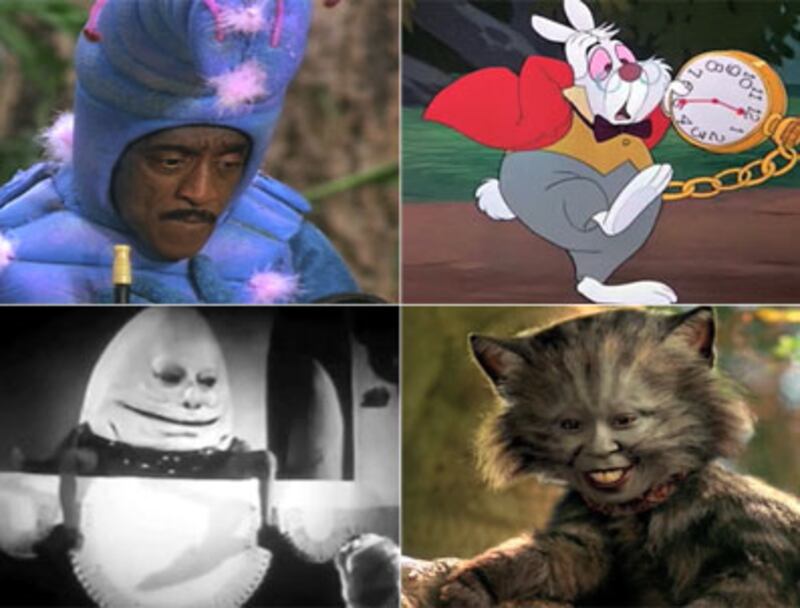 Angsty Alice made her debut in 1999 in the Hallmark made-for-TV movie starring Whoopi Goldberg as the Cheshire Cat, Ben Kingsley as the Caterpillar, and Martin Short as a predictably outrageous Mad Hatter. This preteen Alice (Tina Majorino) has clearly been listening to too much Liz Phair. Drenched in self-doubt and self-loathing, she can't bring herself to sing at a recital, and thus does what any stage-frightened girl who doesn't want to disappoint her parents (who, it's implied, have their own issues) would do: fall head-first down a rabbit hole. The entire premise of the film is based on Alice's fear, which is writ large on Majorino's perpetually furrowed brow and beseeching eyes. Like Carroll's Alice, she's a nerd who likes books, but unlike her predecessor, she's as freaked out by her surroundings as by herself—when she grows into a giant, her look of total disgust seems to go beyond her new proportions.