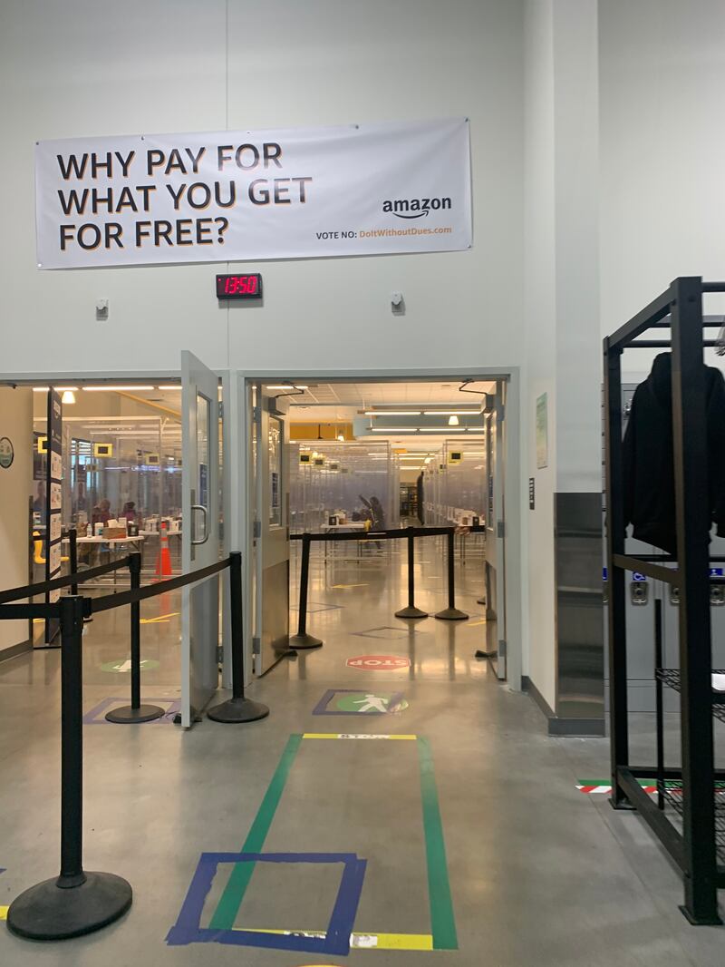 Workers reported receiving constant text messages with anti-union messages, and even seeing pressure-laden signs in the bathroom stalls. “Above the sinks… right beside the stalls,” Connelly said. “[The sign] will say, ‘Every vote counts.’ But then it’ll say, ‘Vote no.’”