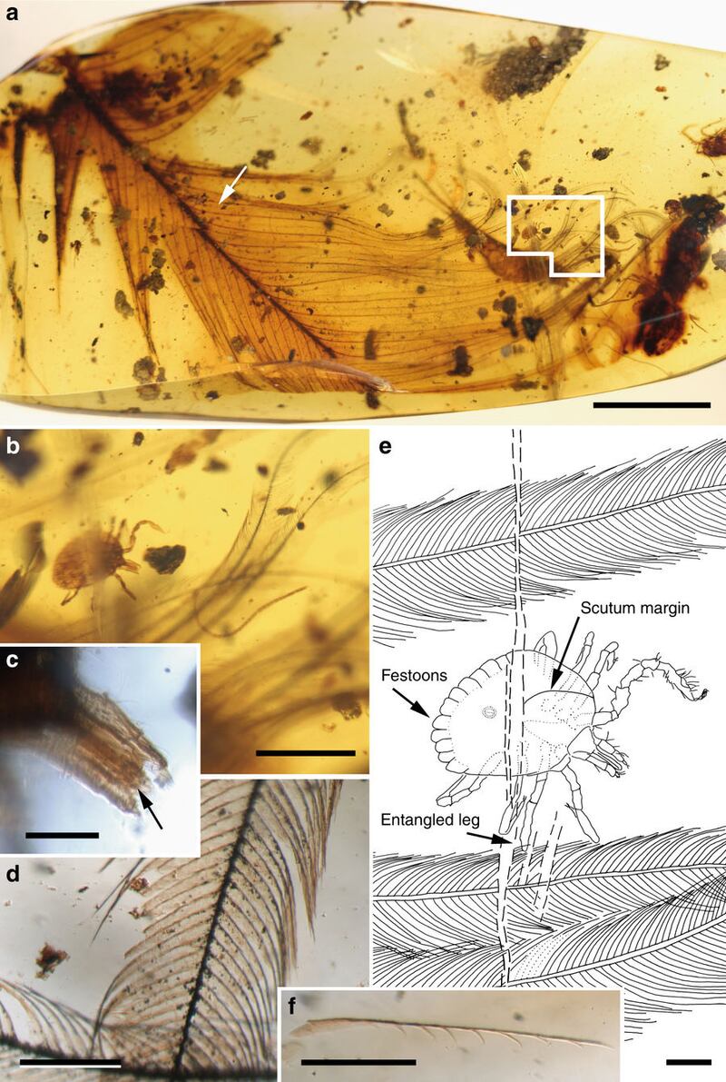 Courtesy Enrique Peñalver, Antonio Arillo, Xavier Delclòs, David Peris, David A. Grimaldi, Scott R. Anderson, Paul C. Nascimbene & Ricardo Pérez-de la FuenteA pair of ticks appear to be tangled in a feather of what some paleontologists believe might be an enantiornithine, a prehistoric ancestor to modern day birds that exhibited teeth and claws beneath their wings. That the two were intertwined in the feather through their hairs, or setae, suggests that the ticks were "cohabitating" with the feathered dinosaur, according to the paper.