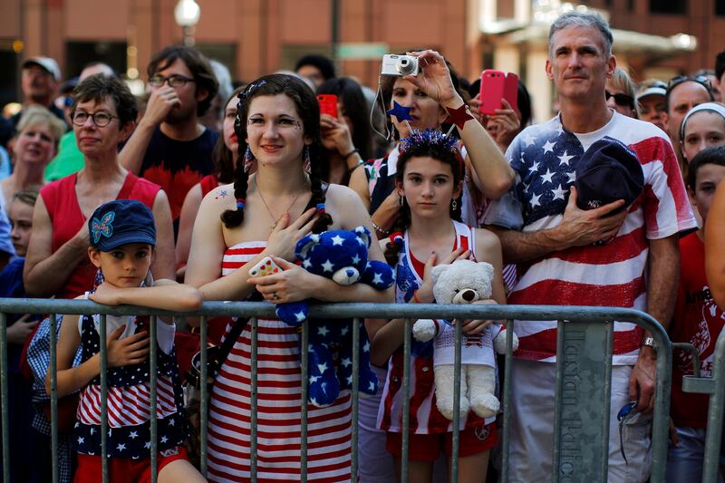 Red, white, and blue looks good on all ages. In Boston, the Haig family stands for the Pledge of Allegiance before a public reading of the Declaration of Independence. Security was tight in Boston, where just two months ago, bombs exploded at the finish line of the city's marathon. In America's big cities, police armed with handheld chemical detectors, radiation scanners, and camera surveillance kept a close eye on celebrations.