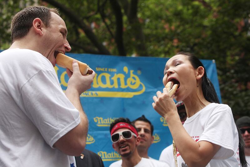What's more American that binge eating? In Coney Island, tens of thousands watched as men's-world-record holder Joey Chestnut and women's-world-record holder Sonya Thomas ate hot dogs during the Nathan's Famous Fourth of July International Hot Dog Eating Contest weigh-in ceremony.