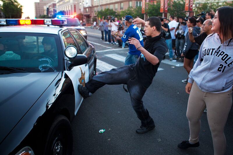 The deaths of Diaz and 21-year-old Joel Matthew Acevedo, who was shot by police Sunday night after, they say, he fired his handgun at an officer while being pursued, sparked four days of violent protests in which riot-clad police officers fired beanbags at women and children and used pepper balls and batons to disperse crowds; protesters hurled rocks, traffic cones and other objects such as shoes, vandalized businesses, and started fires in dumpsters.