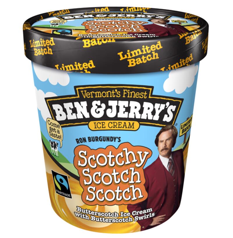 “I love scotch. Scotchy, scotch, scotch. Here it goes. Down into my belly.” Burgundy uttered these memorable lines in 2004’s Anchorman: The Legend of Ron Burgundy and, thanks to ice cream artists at Ben & Jerry’s, there’s a new, limited edition Burgundy-inspired flavor. The concoction, dubbed Scotchy Scotch Scotch, consists of a butterscotch ice cream with butterscotch swirls. And it is delicious.