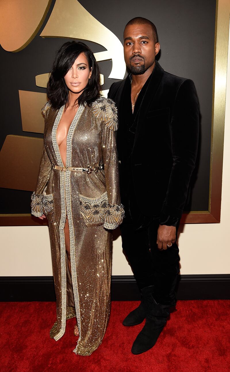 If Sia has the Carrington chatelaine's hair, Kim is wearing Krystle Carrington's old house-coat used for lost mornings polishing the silver at the mansion, or Blake's shiny hair. The Jean Paul Gaultier gown is eighties multipled by the eighties, with added spangle in case you hadn't gotten the message. Kanye had a major fashion moment of his own, showing off serious side-boob in his suit.