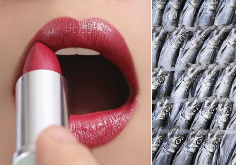 Some shimmery lipsticks owe their twinkle to a rather lowly source—fish scales. According to The Straight Dope, a syndicated question-and-answer column published in over 30 newspapers nationwide, herring scales, a byproduct of commercial food fishing, are processed into a product called “ pearl essence,” which can be found in lipsticks, nail polishes, ceramic glazes, and other sparkly stuff. The fish are caught in giant nets and pumped into boats, a process that flenses the scales from their bodies, often while still alive. The scales are then sold to cosmetic companies.