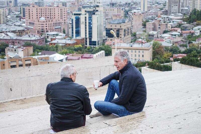 Bourdain has a coffee with Richard Giragosian, the director of think tank the Regional Studies Center, on the Cascade steps looking over Yerevan in Armenia.