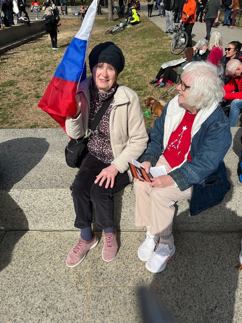 At the Sunday afternoon “Rage Against the War Machine” rally, around a half-dozen Russian flags waved in the air, plus a couple of red Soviet flags with the hammer and sickle. There was no lack of sympathy for Putin, who has committed war crimes in his ongoing and bloody fight against Ukraine.
